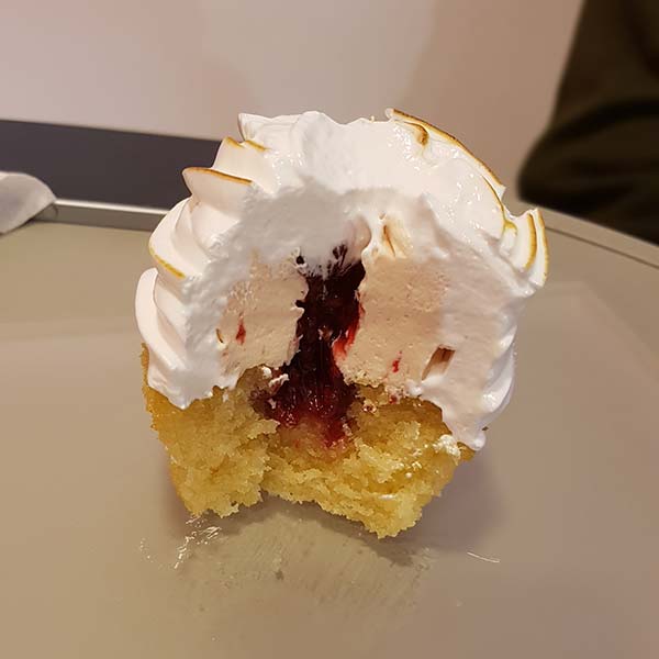Our take on the Bombe Alaska consist of our vanilla bean cupcake, cored and filled with raspberry coulis which has the right tanginess to balance the different layered components of this dessert. We frost the cupcake with strawberry infused buttercream, cover the buttercream frosting and then toast the meringue using a torch.